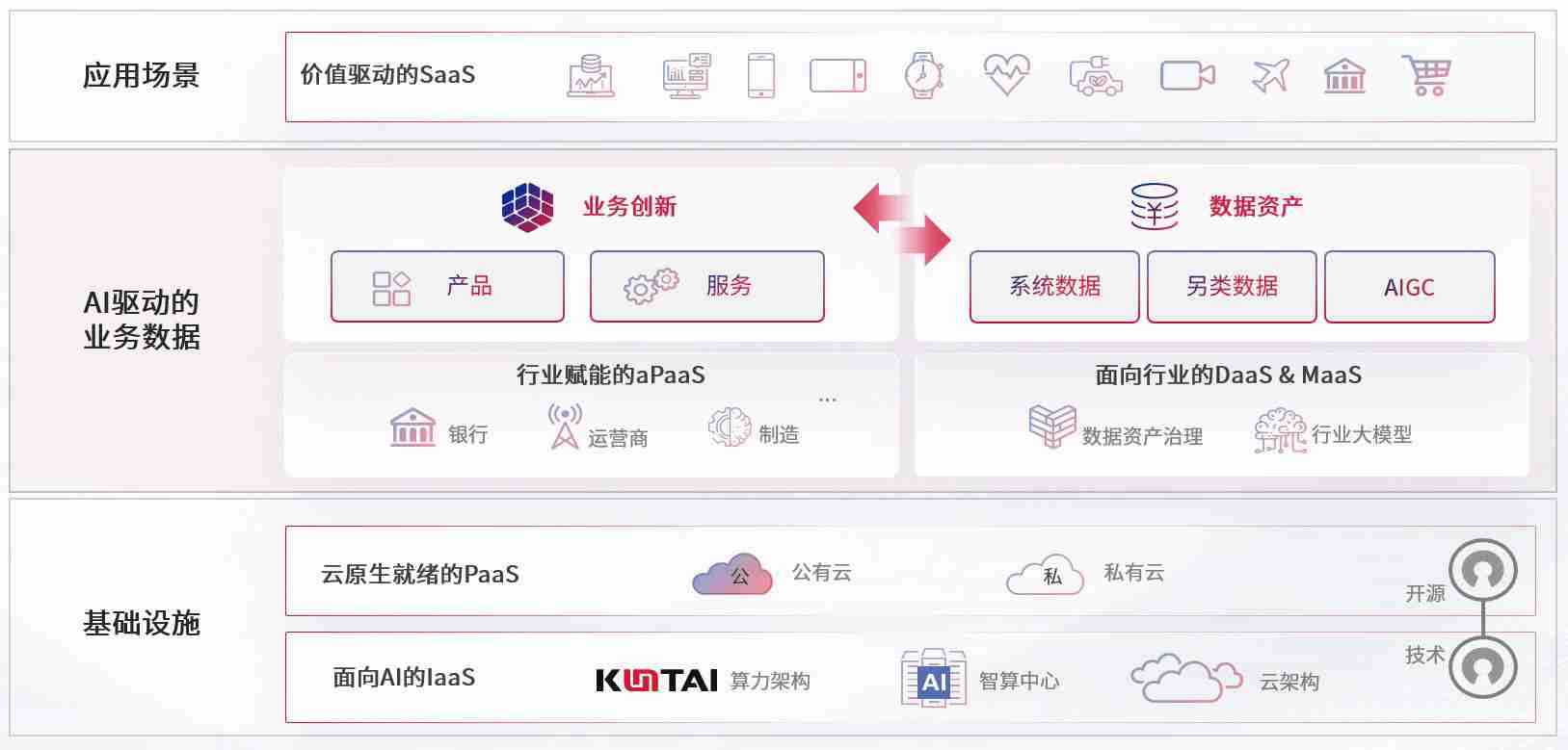 数字时代,,,,围绕企业数字化转型的关键要素,,尊龙旗舰厅数码开创性的提出数云融合战略和技术体系框架,,着力在云原生、、、数字原生、、AI原生和信创产业上架构产品和服务能力,,,,为处在不同数字化转型阶段的快消零售、、汽车、、、、金融、、、医疗、、、政企、、教育、、、运营商等行业客户提供泛在的敏捷IT能力和融合的数据驱动能力,,,构建跨界融合创新的数字业务场景和新业务模式,,,,助力企业级客户建立面向未来的核心能力和竞争优势,,全面推动社会的数字化、、、智能化转型升级。。。。